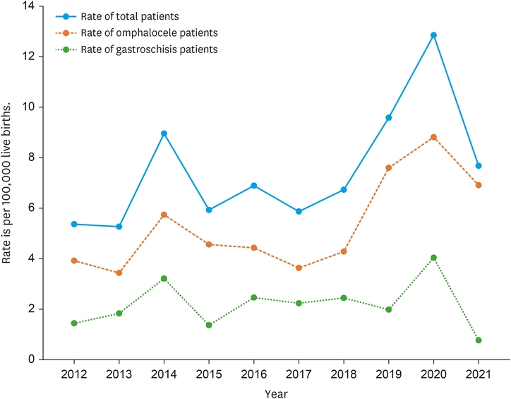 Gastroschisis and omphalocele represent two of the most significant congenital abdominal wall defects confronting pediatric surgeons worldwide [1]. These conditions not only pose substantial challenges in surgical management but also have profound implications for neonatal care, long-term morbidity, and parental support. Although both result from errors during the embryologic development of the fetal abdominal wall, gastroschisis and omphalocele are unique disorders with different clinical sequelae. Gastroschisis is generally a solitary anomaly with postnatal outcomes related to the underlying integrity of the prolapsed bowel. In contrast, omphalocele is frequently associated with other structural anomalies or genetic syndromes that contribute more to postnatal outcomes than the omphalocele defect itself [2]. The incidence and outcomes of gastroschisis and omphalocele vary significantly across different geographic regions and healthcare systems, influenced by factors such as prenatal diagnosis rates, surgical techniques, and postoperative care protocols. In Korea, despite advanced healthcare services and high rates of prenatal screening, comprehensive data on these congenital anomalies have been sparse and fragmented. The Korean Association of Pediatric Surgeons (KAPS) conducted a national survey of its members to assess the birth prevalence of gastroschisis and omphalocele and to analyze data regarding patient characteristics, the rate of associated anomalies, treatment and prognosis of gastroschisis and omphalocele in Korea over the last 10 years. The 2022 annual nationwide survey conducted by the KAPS focused on gastroschisis and omphalocele. The results were first discussed at the KAPS annual meeting in Yeosu on June 9–10, 2022.
