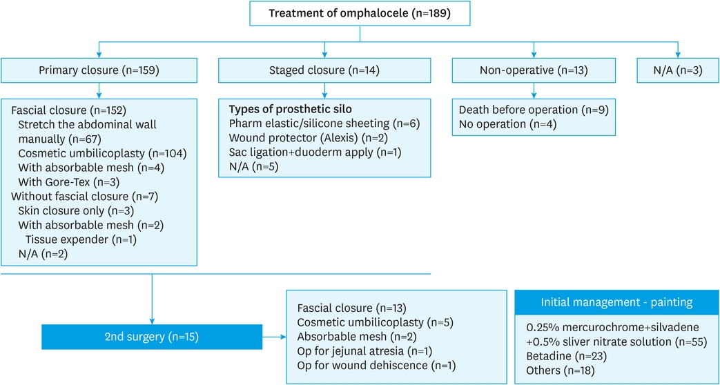 The study analyzed treatment methods for 189 patients with omphalocele, including primary closure, staged closure, and non-operative approaches. Of the total patients, 159 underwent primary closure, 14 underwent staged closure, 13 received non-operative treatment, and 3 were not applicable. For primary closure techniques, fascial closure was performed in 152 patients, with 67 undergoing manual stretching of the abdominal wall and 104 receiving cosmetic umbilicoplasty. Additionally, 4 patients had absorbable mesh, and 3 had Gore-Tex. Fascial closure was not performed in 7 patients; of these, 3 had skin closure only, 2 used absorbable mesh, and 3 were not applicable. In the staged closure group, various types of prosthetic silos were used: Pharm Elastic/silicone sheeting in 6 cases, the Alexis wound protector in 2 cases, Duoderm on the sac in 1 case, and 5 were not applicable. Additionally, 9 patients died before the operation, and 4 did not undergo surgery. After the first-line treatment, including primary closure and staged closure, secondary surgeries were required for 15 patients, including fascial closure in 13 cases, cosmetic umbilicoplasty in 5 cases, absorbable mesh in 2 cases, an operation for jejunal atresia in 1 case, and an operation for wound dehiscence in 1 case. Initial management involved different painting methods, with 55 cases using a solution of 0.25% mercurochrome, Silvadene, and 0.5% silver nitrate, 23 cases using Betadine, and 18 cases using other methods (Fig. 4).