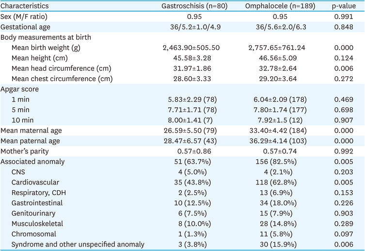 The patient demographics and characteristics highlighted several key differences between gastroschisis and omphalocele cases (Table 2). Both conditions had a similar male-to-female ratio (0.95), but there were significant differences in birth weight and head circumference. Infants with gastroschisis had a lower mean birth weight (2,463.90±505.50 g) compared to those with omphalocele (2,757.65±761.24 g) and a smaller mean head circumference (31.97±1.86 cm vs. 32.78±2.64 cm). The mean maternal and paternal ages were significantly younger in the gastroschisis group compared to the omphalocele group. The frequency of associated anomalies was significantly higher in omphalocele cases compared to gastroschisis cases. Specifically, cardiovascular anomalies were more prevalent in omphalocele patients. Other anomalies such as gastrointestinal, genitourinary, musculoskeletal, chromosomal, and unspecified syndromes were also observed but with less statistical significance (Table 2).