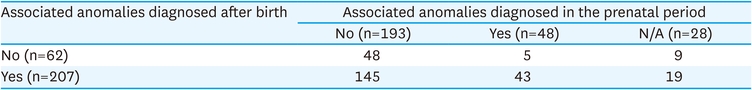 When comparing associated anomalies diagnosed in the prenatal period with the associated anomalies diagnosed after birth, 43 (89.6%) of 48 patients diagnosed with associated anomalies in the prenatal period were found to have associated anomalies after birth, and 48 (24.9%) of 193 patients diagnosed with no associated anomalies in the prenatal period were found to have no associated anomalies after birth. As a result, the diagnosis of associated anomalies in prenatal period was confirmed to have high sensitivity but low specificity (Table 4).
