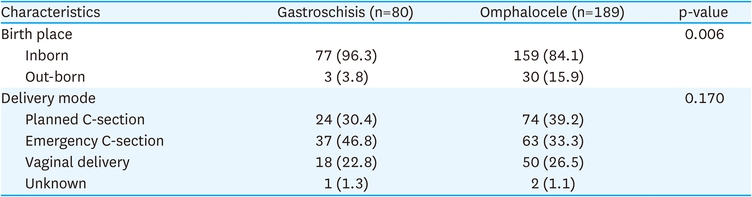 Clinical characteristics of patients with gastroschisis and omphalocele