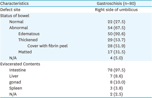 Gastroschisis was an abdominal wall defect, located right side to a normal umbilicus, and not involving the umbilical ring. The herniated viscera were often covered by exudate but never by membranes and the status of bowel was normal in 22 (27.5%) patients and abnormal in 54 (67.5%). In gastroschisis, the organs of eviscerated contents were 78 (97.5%) in intestine, 8 (10.0%) in gonad, and 7 (8.6%) in liver (Table 6).