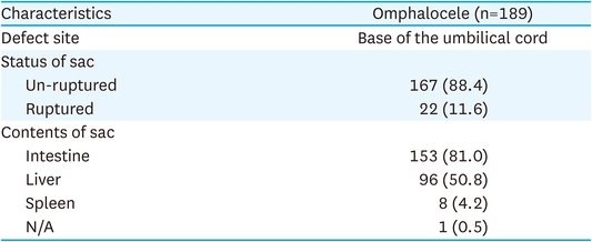 Omphalocele was an abdominal wall defect limited to an open umbilical ring. The viscera was herniated into the base of the umbilical cord and was covered by membranes or remnants of membranes that could be called sac in all patients. During the investigation period, there were 22 (11.6%) patients where sac was ruptured in omphalocele. In omphalocele, the organs of the content in the sac were 153 (81.0%) in intestine, 96 (50.8%) in liver, and 8 (4.2%) in spleen (Table 7).