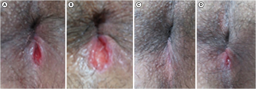Most studies on CD-related anal fistulas simply considered the presence/absence or recurrence of anal fistulas but did not describe the characteristics of anal fistula itself. Accordingly, our findings are significant as we characterized the morphology of anal fistulas and surgical sites while investigating their relationship with CD, which could provide further insights into anal fistula pathophysiology. Fig. 1 shows the abnormal progression of wound healing at the surgical sites at 76, 101, 139, and 153 days after surgery for anorectal abscess referred from another hospital after incision and drainage. Slight recovery was observed at day 139; however, the wound worsened and did not heal. The patients were diagnosed with CD after colonoscopy. Fig. 2 shows delayed wound healing as well as friable, edematous, and granulation tissues at 57, 55, and 71 postoperative days.
