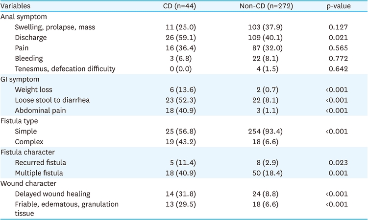 Among 316 patients who underwent surgery for anal fistula, 44 patients were diagnosed with CD (CD group), while 272 patients were not diagnosed with CD (non-CD group). Table 1 describes the patient characteristics. The mean age at diagnosis was 16.4 and 17.1 years in the CD and non-CD groups, respectively. Male patients accounted for 93.2% in the CD group, compared to 97.8% in the non-CD group. The mean follow-up duration was 79.8 and 24.5 months in the CD and non-CD groups, respectively. In the CD group, 63.6% and 20.5% had a history of anal abscess and fistula, respectively. The CD group exhibited a significantly higher incidence of patients with a history of anal fistula compared to the non-CD group (p=0.008). In the CD group, 9.1% of patients had a family history of IBD, whereas in the non-CD group, this figure was 0.4%, showing a significant difference between the groups (p=0.001). There was no significant between-group difference in body weight, body temperature, and white blood cell (WBC) count. The level of C-reactive protein (CRP) was 0.7 (0–7) in the CD group and 0 (0–0.6) in the non-CD group, demonstrating a significant difference between the groups (p=0.001).