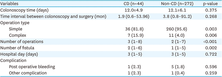 There were no significant between-group differences in colonoscopy time, time interval between colonoscopy and surgery, hospital day and complications (Table 3). Among the surgical complications, postoperative bleeding usually occurred within 1–7 postoperative days, with some cases recovering after performing procedure to stop bleeding in operating room. Among two patients who developed non-specific complications, one had sore throat and the other one had headache. Simple operations included fistulectomy with lay open, fistulectomy with a stage seton, and fistulectomy with a cutting seton. Complex operations were defined as procedures involving high seton placement with rectal opening or sphincter-saving techniques such as muscle closure. The complex operation was more frequently performed in the CD group (15.9%, p=0.006). Additionally, the number of operations and the number of fistulas were higher in the CD group (p<0.001, p=0.002).