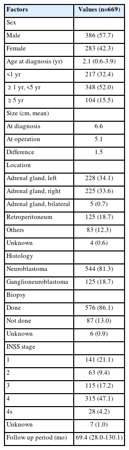 Fig. 2). There were slightly more males than females (M:F=1.36:1). The median age at diagnosis was 2.1 years. Patients who were diagnosed under one year of age 32.4%. The interquartile range of age at diagnosis was 0.6–3.9 years, which means 75% of patients were diagnosed with neuroblastoma at less than 5 years of age. Moreover, only 15.5% of patients were diagnosed with neuroblastoma after 5 years of age. The mean size at diagnosis was 6.6 cm, and the size reduced to 5.1 cm during surgery. The adrenal gland was the most common site (68.4%); other retroperitoneal sites apart from the adrenal gland were the second most common in this study. Laterality in the location of tumors was not observed for tumors of adrenal origin in this study (left: 34.1% vs. right: 33.6%). Bilateral tumors were extremely rare (0.7%). Histologic investigation revealed that neuroblastoma was more common than ganglioneuroblastoma (81.3%, 544:125). Biopsy was performed in 86.1% of all patients. Stage 4 neuroblastoma, according to the International Neuroblastoma Staging System (INSS), was the most common stage (47.1%). Stage 1 was the second most common in this study (n=141, 21.1%). The median follow-up period was 69.4 months. Detailed demographic data are presented in