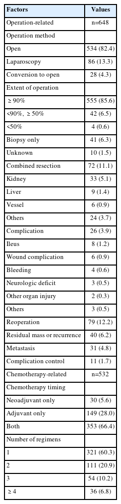 Table 2). The proportion of patients who underwent laparoscopy and conversion to open surgery were 13.3% and 4.3%, respectively. Near total excision was achieved in 85.6% of patients, and only 4 patients failed to achieve an extent of operation greater than 50%. Combined resection of the tumor and other organs, such as the kidney, liver, and blood vessels, was required in 11.1% of all patients that underwent surgery. The kidney was the most affected organ (45.9% of all combined resection cases). Only 3.9% of the patients who underwent operation experienced complications after surgery. The most common complication was ileus, accounting for nearly one-third of patients with complications. Wound complications, bleeding, and neurologic deficits, in that order, were the other common complications. Reoperation was needed in 12.2% due to a residual mass or recurrence (n=40, 6.2%), metastasis (n=31, 4.8%), or complications (n=11, 1.7%).