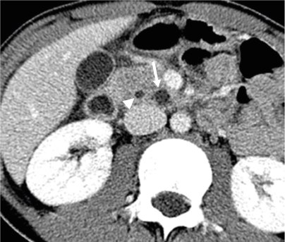 Abdominal computerized tomography reveals a small cystic mass (arrow) in the pancreatic uncinate process. The adjacent pancreatic duct (arrowhead) is mildly dilated.