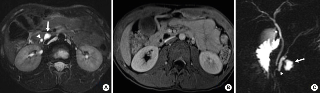 (A) T2-weighted MRI reveals a small, lobulated cystic mass (arrow) in the pancreatic uncinate process. The adjacent pancreatic duct (arrowhead) is mildly dilated. (B) No solid enhancing components were revealed on T1-weighted MRI obtained after contrast administration. (C) Oblique-coronal, thick-slice magnetic resonance cholangiopancreatography reveals a lobulated cystic mass (arrow) and associated pancreatic duct dilatation (arrowhead).