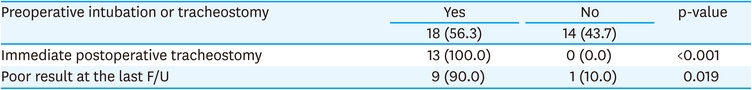 In addition, preoperative intubation or tracheostomy status had a statistically significant effect on immediate postoperative tracheostomy and poor outcomes. Preoperative intubation or tracheostomy status may reflect the patient’s poor preoperative status, which affects the postoperative outcome. However, in this study, a comparison between preoperative intubation or tracheostomy status and preoperative status was not performed.