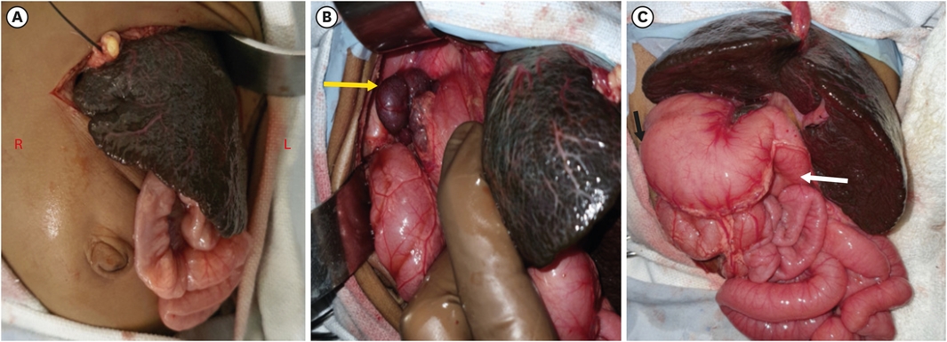 Showing appearance (color and neo capillaries) of the liver and left sided incision (A), polysplenia (B) on the right side (yellow arrow) of the abdomen, greater curvature (black arrow) towards right and the duodeno-jejunal flexure (white arrow) in the midline.