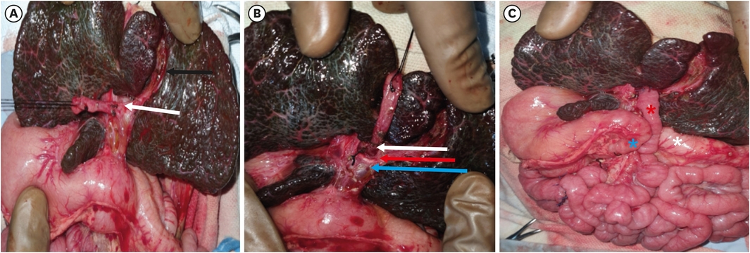 The child was taken for an intraoperative cholangiogram which suggested the absence of the extrahepatic bile ducts and a decision for Kasai portoenterostomy (KPE) was taken. The left subcostal incision was extended towards the midline and to the right. On exploration, the liver was dark-colored, cirrhotic, and firm (Fig. 1A), polysplenia was present over the right side (Fig. 1B), the stomach was on the right side (Fig. 1C), duodenojejunal (DJ) flexure was in the midline and the ileocecal junction was free lying. The GB was dissected from its bed and dissection was done towards the porta hepatis (Fig. 2A). The proper hepatic artery and its bifurcation were identified, and they were overlapping the portal vein bifurcation (Fig. 2B). The portal plate was dissected in between the portal vein bifurcation (Fig. 2B), Roux loop of the jejunum (20 cm) was created 15 cm from DJ flexure and it was brought towards the porta. Portoenterostomy was done with interrupted delayed absorbable 5-0 sutures (Fig. 2C) and a liver biopsy was taken.
