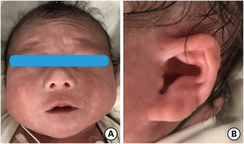(A) Hypertelorism, narrowed palpebral fissures, prominent nose with anteverted nostrils, shortened philtrum, and a recessed and small chin and (B) malformed and low-set ears.