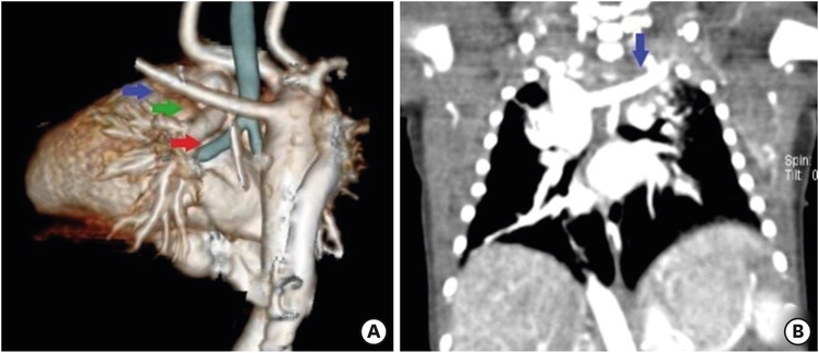 (A) Pulmonary 3D CT angiography showing right-sided aortic arch (green arrow), hypoplastic superior vena cava, prominent azygos vein (red arrow), and aberrant left subclavian artery (blue arrow) and (B) coronal view revealing aberrant left subclavian artery (blue arrow).