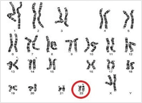 Chromosomal study revealing 22q11.2 microdeletion.