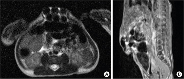 A 32-year-old healthy mother (gravida 0, para 0) delivered a female infant at 40 weeks and six days of gestation via emergency cesarean section due to complications of oligohydramnios. The infant weighed 2.5 kilograms and Apgar scores were eight and nine at 1 and 5 minutes, respectively. The vital signs of the infant were stable on physical examination. A 4×3 cm abdominal mass was observed, covered in normal skin, which extended from the umbilicus to the xiphoid process. Intestinal movement was visible through the skin (Fig. 1).