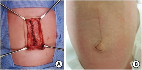 (A) The operative picture after closure of the muscle layer and (B) appearance on the seventh postoperative day.
