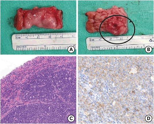 On the first day of hospitalization, formula feeding was started. There were no symptoms after the diet progressed. On the second day of admission, the patient became irritable and bloody stools recurred. Ultrasonography showed recurrence of intussusception and a second air reduction was performed. After successful decompression, the patient had a follow-up ultrasound the next day. On ultrasonography, ileocolic intussusception was re-developed in the right abdomen and 1.4 cm long low echoic focal eccentric wall thickening was observed in the distal part of intussuscipiens (Fig. 1A). This was the lesion thought to be the lead point. A third air reduction was performed for recurrent intussusception. After the patient was stabilized, abdominal computed tomography (CT) was performed to evaluate the lesion suspected as a lead point on ultrasound. On CT scan, the lesion appeared to be in the form of focal enhancing wall thickening with recurred ileocolic intussusception (Fig. 1B). There were no findings suggestive of Meckel's diverticulum or duplication cyst. The patient was diagnosed with intussusception with a lead point. The patient underwent exploratory laparoscopy. Laparoscopic reduction of intestine was performed for findings of intussusception. We used 3 mm laparoscopic instruments during surgical reduction of intussusception. Two graspers were mainly utilized during the procedure. We grasped the proximal ileum and cecum with laparoscopic graspers and gently pulled both ends apart. Care was taken not to injure the bowel during the procedure, both at the point where the bowels were grasped and around the intussusceptum. The serosal surface of the terminal ileum showed a dimpling spot and vague surrounding irregularity after successful reduction. Also, firmness of the bowel surrounding the dimpling spot was felt through the laparoscopic instruments. It was fairly obvious that there was a mass lesion within (Fig. 2A). In the intra-lumen of ileum, there was a solid, immobile mass-like lesion of 1 cm in size with central ulceration (Fig. 2B). The umbilical incision was extended craniocaudally and a wound protector was applied. The cecum and terminal ileum were mobilized and externalized through the umbilical incision. A firm, fixed mass was felt on the ileum wall 5 cm proximal to the ileoceceal valve and 4 cm segment of the surrounding ileum was resected. The ileal ends were anastomosed in end-to-end fashion with interrupted running sutures. The patient recovered without complications. He was discharged on the sixth day after surgery. Histopathological examination of the lesion revealed features of diffuse large B-cell lymphoma (Fig. 2C and D). We referred the patient to the Department of Pediatric Oncology for evaluation and initiation of chemotherapy treatment. This disease was classified as stage II germinal center B-cell like diffuse large B cell lymphoma. Patients and parents showed good adherence to treatment and followed recommendations of the oncologist.