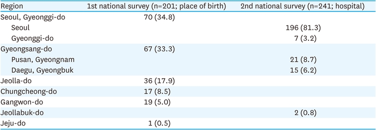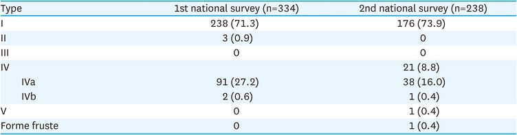 A total of 348 patients were enrolled in the first national survey, which included 59, 63, 73, 74, and 79 patients in 1997, 1998, 1999, 2000, and 2001, respectively. A total of 241 patients were enrolled in the second national survey, which included 89, 81, and 71 patients in 2013, 2014, and 2015, respectively (Fig. 1).