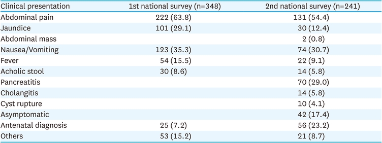 Regarding the clinical presentation of choledochal cysts, abdominal pain was the most common symptom with 222 (63.8%) patients, followed by nausea/vomiting and jaundice in 123 (35.3%) and 101 (29.1%) patients, respectively, in the first national survey. Similarly, in the second national survey, abdominal pain was the most common symptom with 131 (54.4%) patients, followed by nausea/vomiting in 74 (30.7%) patients (Table 3).