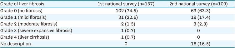 For the preoperative liver fibrosis of patients with choledochal cysts, in the first national survey, 102 (74.5%) and 31 (22.6%) patients were grades 0 and 1, respectively. In the second national survey, 69 (63.3%) and 19 (17.4%) patients were grades 0 and 1, respectively (Table 6).
