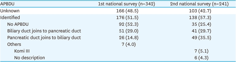 In the first national survey, regarding the presence or absence of APBDU, it was confirmed in 176 (51.5%) patients. Additionally, 92 (52.3%), 51 (29.0%), and 26 (14.8%) patients did not have APBDU, had biliary duct to pancreatic duct type, and had pancreatic duct to biliary duct type, respectively. In the second national survey, it was confirmed in 138 (57.3%) patients. Moreover, 35 (25.4%), 41 (29.7%), and 49 (35.5%) patients did not have APBDU, had biliary duct to pancreatic duct type, and had pancreatic duct to biliary duct type, respectively (Table 7).