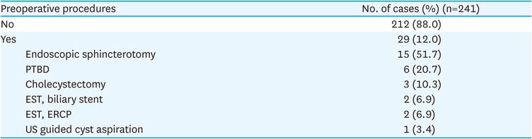 In the first national survey, KAPS members were asked about preoperative diagnostic methods, and ultrasonography (97%) and computed tomography (70%) were performed most frequently. In the second national survey of 241 patients, ultrasonography and magnetic resonance cholangiopancreatography were performed in 213 (88.4%) and 195 (80.9%) patients, respectively (Table 9). Furthermore, in the second national survey, 212 (88.0%), 15 (51.7%), and 6 (20.7%) patients did not undergo a preoperative procedure, underwent endoscopic sphincterotomy, and underwent percutaneous transhepatic biliary drainage, respectively (Table 10).
