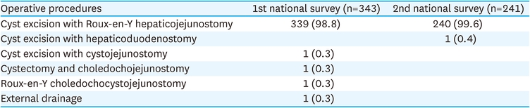 A total of 348 and 241 patients with choledochal cysts were enrolled in the first and second national surveys, respectively. The male-to-female ratio was 1:3.4 and 1:2.7 in the first and second national surveys, respectively. In both national surveys, abdominal pain was the most common clinical symptom. The most common type of choledochal cyst was type I in 71.3% and 73.9% of patients in the first and second national surveys, respectively. In the first national survey, all 348 patients underwent open surgery. However, in the second national survey of 241 patients, open, laparoscopic, and robotic surgeries were performed in 102 (42.3%), 75 (31.1%), and 56 (23.2%) patients, respectively. Cyst excision with Roux-en-Y hepaticojejunostomy was performed in 339 (98.8%) of 343 patients in the first national survey and 240 (99.6%) of 241 patients in the second national survey.
