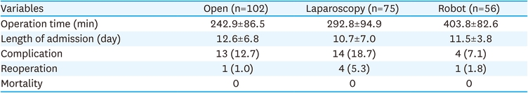 The mean operation time was 242.9±86.5, 292.8±94.9, and 403.8±82.6 minutes for open, laparoscopic, and robotic surgeries, respectively. The mean length of admission was 12.6±6.8, 10.7±7.0, and 11.5±3.8 days for open, laparoscopic, and robotic surgeries, respectively. Postoperative complications developed in 12.7%, 18.7%, and 7.1% of patients in open, laparoscopic, and robotic surgeries, respectively. Reoperation was performed in 1.0%, 5.3%, and 1.8% of patients in open, laparoscopic, and robotic surgeries, respectively. No mortality cases were noted in all surgeries (Table 14).