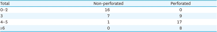 Based on our data we propose a cut off score greater than 2 suggests perforated appendicitis and score 0–2 suggests no perforation with sensitivity 100% and specificity 66.67%.