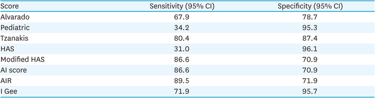 In comparison with other scores, we note a specificity of 95% and accuracy of 81% with AUC 0.945, higher than previous described scores (Table 5) [5, 11, 12].