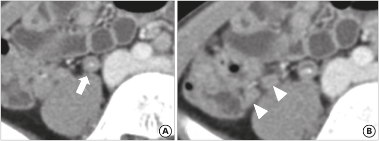Preoperative ACT findings for a 13-year-old male patient, who was demonstrated to have lymphoid hyperplasia: (A) appendicolith (arrow) and (B) luminal distension (arrowheads) were observed, but there were no other diagnostic abnormalities in ACT.