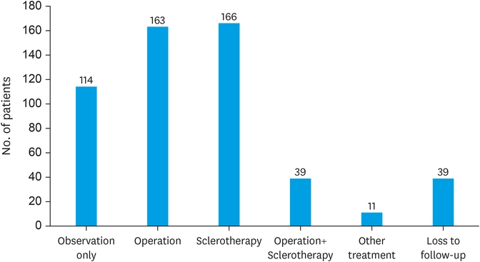 We grouped treatment methods into 5 categories: observation only; operation; sclerotherapy; operation and sclerotherapy; and other treatments (Fig. 2). Operation with observation and sclerotherapy with observation were classified as operation and sclerotherapy, respectively.