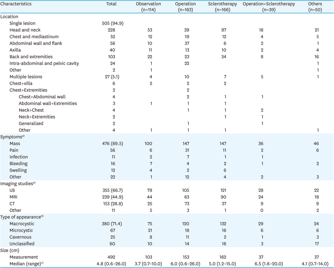 The authors reviewed and analyzed the clinical data of patients who started treatment for lymphangioma in KAPS members’ hospitals from 2011 to 2013. Their follow-up data were also included in the study. We used Microsoft Access 2016® (Microsoft, Redmond, WA, USA) for patient registry and data collection. All the data were analyzed using the IBM SPSS version 23 statistical software package (IBM Co., Armonk, NY, USA).