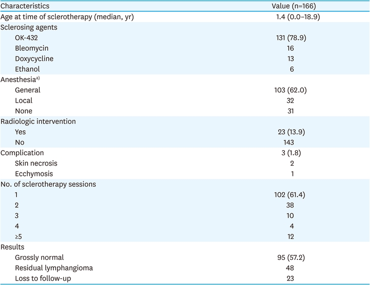 The authors reviewed and analyzed the clinical data of pediatric patients who started treatment for lymphangioma in hospitals of KAPS members from 2011 to 2013. Their follow-up data is also included in the study.