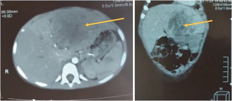 A 3-year-old male child presented with a high-grade fever associated with chills and rigors for the past 8 months. The fever was associated with abdominal pain and distension for the past 3 months. There was no history suggestive of night sweats, weight loss, loss of appetite, malaise, shortness of breath, chest pain, cough with bloody sputum, or jaundice. He was initially referred from the Department of Pediatric Haemato-oncology, where he was being worked up for liver malignancy. On examination, the child was pale but moderately built and nourished. The child was active and hemodynamically stable. The abdomen was distended with a firm mass, 6×7 cm palpable in the left upper quadrant-umbilical and left hypochondrium regions. The mass was continuous with the liver dullness and was moving cephalo-caudally with respiration. There was no evidence of ascites or any other organomegaly. Laboratory values of hemoglobin 12 g/dL, total leucocyte count 21,500 with eosinophilia of 3,440 (neutrophils 57%, lymphocytes 26%, eosinophils 16% and monocytes 1%), platelets 5.2 lakhs, electrolytes (sodium 140 mEq/L, potassium 4.2 mEq/L and chloride 103 mEq/L), urea 23 mg/dL and urea 0.4 mg/dL and liver function tests, were within normal limits. The serum alpha-fetoprotein was 0.797, contrast-enhanced computed tomography (CECT) abdomen showed a large focal lesion of size 7.3×5.8×4.7 cm involving segments IVa, II, III with central necrosis (Fig. 1). There was no evidence of air or calcification. The arterial phase showed hypervascularity or centripetal enhancement enhancing the terminal part of the left hepatic vein. The left branch of the portal vein was attenuated in its proximal part and not visualized in the distal part. No satellite lesions were appreciated.