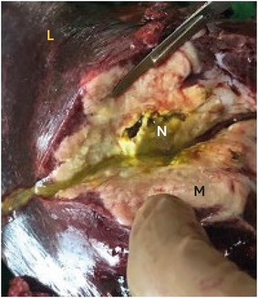 L, liver tissue; N, necrotic material; M, fungal mass.