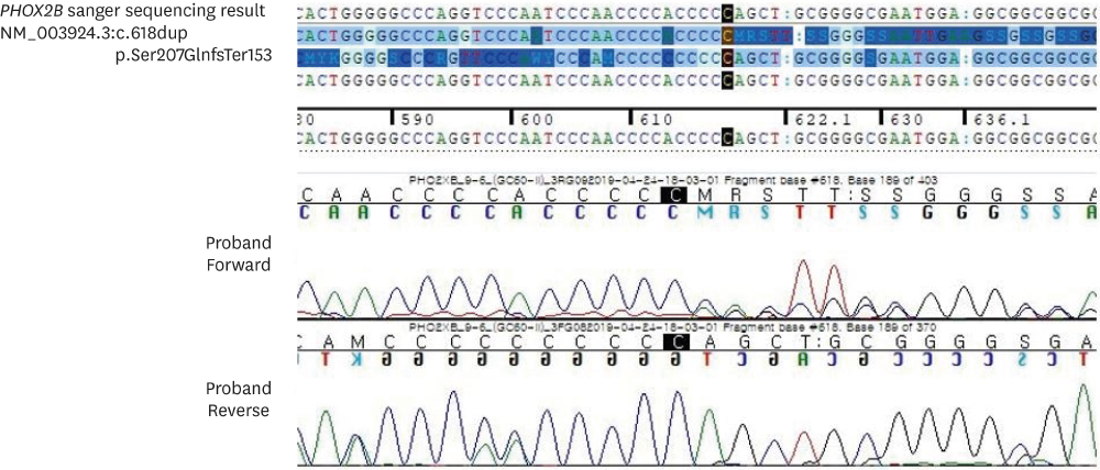 After surgery, the patient seemed to recover without lung complications, but it was impossible to disconnect the ventilator owing to recurrent apnea and hypercarbia upon extubation. Brain magnetic resonance imaging, electroencephalograph, and echocardiography were performed to identify the cause of desaturation but yielded no specific findings. Upon reviewing the patient's symptoms, clinical progression, and test results, Haddad syndrome was strongly suspected. On the 11th day of life, we performed a genetic study and confirmed the presence of a PHOX2B mutation. A heterozygote c.618dup mutation which causing a frameshift mutation in exon 3 of the gene was confirmed via Sanger sequencing (Fig. 3). It was described as NM_003924.3(PHOX2B):c.618dup in accordance with the recognized nomenclature and has been reported to be linked to CCHS in a previous study. Tracheostomy was performed, and treatment was continued at home using a mechanical ventilator. This report was exempt from Institutional Review Board (IRB) review.