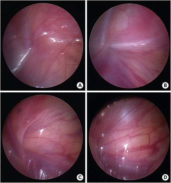 Laparoscopic finding of contralateral internal ring: (A, B) presenting negative contralateral patent processus vaginalis, (C, D) presenting positive contralateral patent processus vaginalis. (A) No veil. (B) Concave type but not perforated. (C) Defect in the contralateral internal ring. (D) Bubble visualized during external compression.