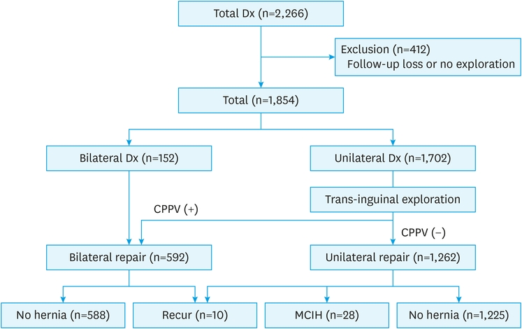 Dx, Diagnosis of inguinal hernia; CPPV, contralateral patent processus vaginalis; MCIH, metachronous contralateral inguinal hernia.