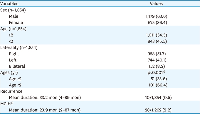 There were 1,179 boys and 675 girls. The average age at surgery was 38.3 months (n=1,011 children, aged over 2 years and n=843, aged below 2 years). The preoperative diagnoses were right hernia (n=958), left hernia (n=744), and bilateral hernia (n=152). The bilateral hernia was more common in younger children, particularly those aged below two years. (Table 1).
