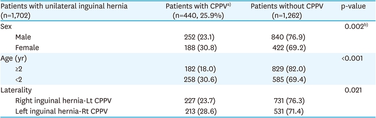 In total, 28 (2.2%) children without CPPV based on a thorough contralateral transinguinal exploration developed MCIH, which required subsequent additional operation. Twenty boys and eight girls were diagnosed with MCIH. MCIH occurred in 13 of the right inguinal hernia patients and 15 of the left hernias. The average age of patients who developed MCIH was 37 months (n=16, children aged over 2 years and n=12, children aged below two years). There was no correlation between gender, age, and laterality of initial hernia and the occurrence of MCIH (Table 3).