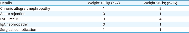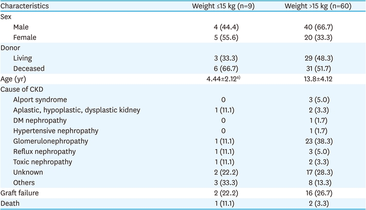 We retrospectively reviewed the medical records of 69 recipients 18 years of age or younger at the time of KT performed at Samsung Medical Center (Seoul, Korea) from January 1994 to July 2019. According to the weight of the patient at the time KT was performed, the analysis was divided into 2 groups: recipients exceeding 15 kg and recipients weighing 15 kg or less. Donor characteristics, cause of CKD, surgical complications, graft survival and patient survival data were collected. Graft loss was defined as initiation of renal replacement therapy following KT or death of the recipient with a functioning graft.
