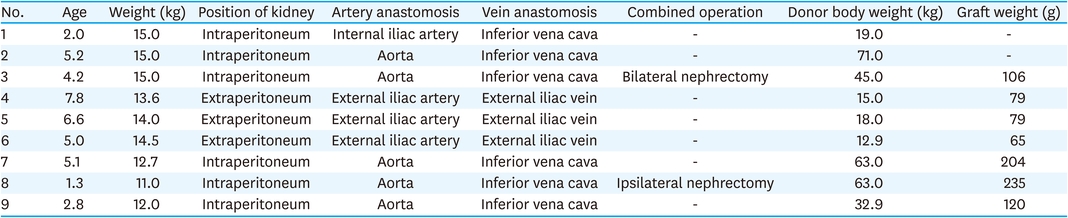 Median weight of the kidney allograft was 106 g (range, 65–235 g). The allograft was implanted intraperitoneally in 6 cases and extraperitoneally in 3 cases. Arterial anastomosis was performed to the internal iliac artery in 1 case, the aorta in 5 cases, and to the external iliac artery in 3 cases. Vein anastomosis was performed to the inferior vena cava in 6 cases and the external iliac vein in 3 cases (Table 2).