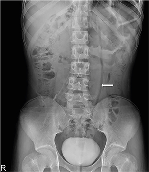 Abdominal X-ray showing decompression of the volvulus by means of a rectal tube (arrow).