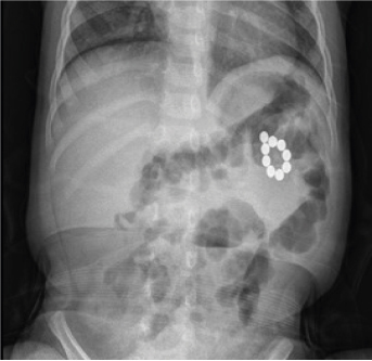 Abdominal X-ray demonstrating 11 bead-shaped magnets in mid abdomen.