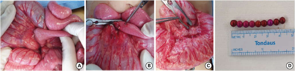 A 2-year-old boy presented with abdominal pain and bilious vomiting for 6 days. He had a fever for 3 days. He ingested multiple bead-shaped magnetic toys. On admission, he had abdominal pain and mild fever (body temperature, 37.5°C). His abdomen was soft, mildly tender, and not distended on physical examination. Laboratory findings were normal. Abdominal radiography revealed no free air and 11 bead-shaped magnets arranged in a circle (Fig. 1). Serial radiographs were followed up for 2 days. They showed no significant change in the position of the magnets, and the abdominal pain did not improve. Therefore, exploratory laparotomy was performed. Multiple perforations of the jejunum caused by the loops of magnets were found approximately 15 and 35 cm distal to the Treitz ligament. It was not appropriate to perform primary repair because there are too many perforation sites in the short bowel loop and discoloration was observed. Twenty-five cm of the jejunum, including all 5 perforation sites, was resected, and a primary anastomosis was made (Fig. 2). He had an uneventful postoperative recovery course and was discharged on the fifth postoperative day.