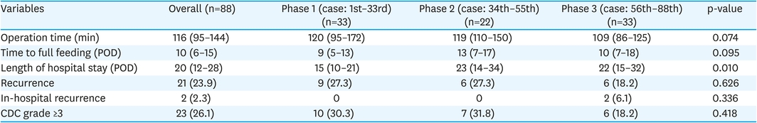 In interphase comparisons of surgical outcome of operator A (Table 2), the median operation time was similar with differences between all phases occurring within 10 minutes (p=0.074). The recurrence rate decreased from 27.3% in phases 1 and 2 to 18.2% in phase 3 (p=0.626). Open conversion was not observed in any phase. Time to full feeding, in-hospital recurrence rate, and rate of complication (Clavien-Dindo classification (CDC) grade 3 or higher) did not show significant differences between phases. However, the length of hospital stay was 15 days postoperatively in phase 1 which was the shortest among the three phases (p=0.010).