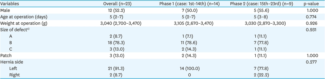 Interphase comparison of baseline clinical characteristics of operator B also showed no significant differences (Table 3). Patients with CDHSG type B was 78.6% in phase 1 and 77.8% in phase 2 (p=0.926). Patch application rate in each phase was 14.3% and 11.1% (p=1.0). There was no significant difference in operation time and postoperative outcome between phases of operator B (Table 4). Recurrence rate and rate of complication (CDC grade 3 or higher) were both higher in phase 1 without statistical significance.